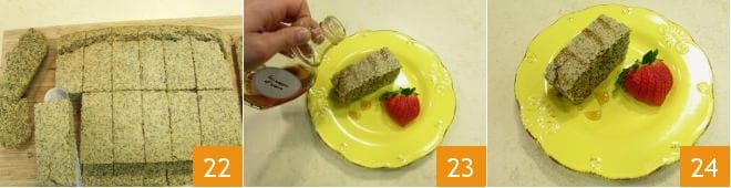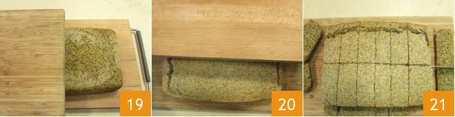 puis placez une autre planche à découper ou un plat rectangulaire de service sur le pain de maïs 19 et retournez à nouveau 20. Coupez le pain de maïs en nombreux rectangles pour le servir 21.