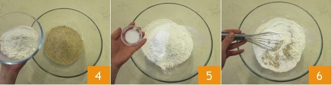 Entre-temps, dans un bol, versez la farine 00 et la farine de maïs noire 4, puis la levure chimique pour préparations salées et le sel 5. Vous devrez bien mélanger le tout avec un fouet 6.