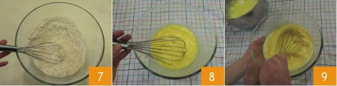 Cette étape est très importante pour que la levure soit répartie uniformément 7, afin d'obtenir un pain avec une cuisson uniforme, sans parties plus hautes ou plus basses. Dans un autre bol, versez les œufs et battez-les 8. Il est maintenant temps d'ajouter le lait et le beurre chauds au mélange d'œufs. Pour éviter que l'œuf ne cuise et ne crée un effet "omelette", attendez quelques minutes ; puis placez un torchon sec sous le bol avec les œufs battus, prenez le fouet et versez lentement le mélange chaud de lait et de beurre en remuant énergiquement et de manière continue 9.