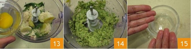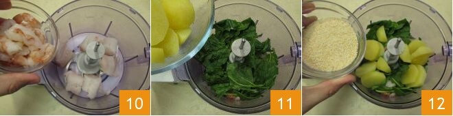 Une fois que les pommes de terre sont cuites, laissez-les tiédir, puis pelez-les. Maintenant, mettez dans le mixeur le cabillaud, les crevettes 10, les épinards frais bien lavés et séchés, ajoutez les pommes de terre 11 et la chapelure 12, salez et poivrez.