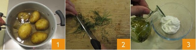 Pour réaliser les côtelettes de poisson avec sauce au yaourt, faites d'abord bouillir les pommes de terre 1 pendant environ 30 minutes ou jusqu'à ce qu'elles soient tendres (le temps de cuisson peut varier en fonction de leur taille). En attendant, préparez la sauce : hachez le fenouil au couteau 2, dans un petit bol, versez le yaourt et l'huile d'olive 3.