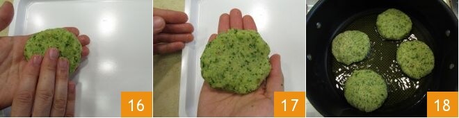 Prenez une portion de pâte, donnez-lui une forme ronde et aplatissez-la légèrement 16 pour obtenir une côtelette, au fur et à mesure que vous les formez, placez-les sur un plateau 17. Une fois prêtes, mettez-les à raffermir au congélateur pendant 10 minutes. Terminez par la cuisson des côtelettes : chauffez 4 cuillères à soupe d'huile dans une casserole, prenez les côtelettes raffermies et faites-les cuire pendant 3 minutes d'un côté et 2 minutes de l'autre 18.