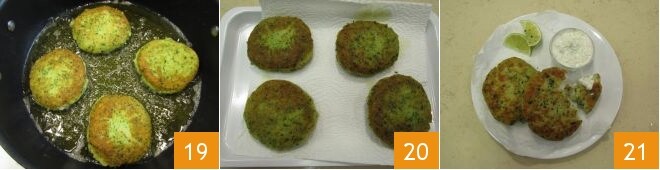 Quand elles auront une belle couleur dorée 19, égouttez-les et transférez-les sur un plateau recouvert de papier absorbant 20. Servez les côtelettes de poisson encore chaudes accompagnées de la sauce au yaourt 21.