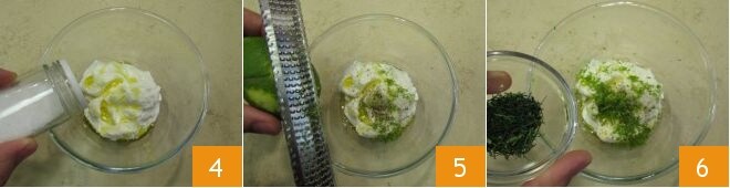 Salez 4, poivrez, aromatisez avec le zeste de lime 5 et avec le fenouil haché 6.
