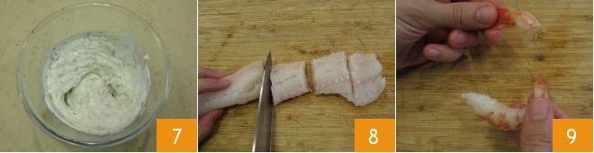 Mélangez 7 pour bien amalgamer et conservez au réfrigérateur jusqu'au moment de servir. Coupez en tranches le filet de cabillaud déjà nettoyé 8 puis décortiquez les crevettes 9 en suivant notre fiche : Comment nettoyer les crevettes. Une fois nettoyées, vous obtiendrez environ 150 g de crevettes.