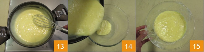 en remuant avec un fouet, jusqu'à ce qu'elle devienne lisse et épaisse 13. Transférez la crème dans un bol 14, couvrez d'un film plastique au contact 15 et laissez refroidir d'abord à température ambiante, puis au réfrigérateur.