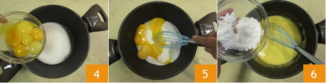 Pendant ce temps, dans une autre casserole, versez les jaunes d'œufs et le sucre 4. Mélangez bien avec une spatule 5, puis ajoutez la fécule 6