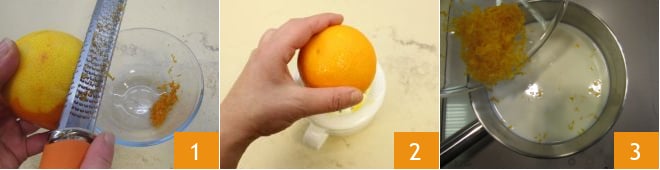Pour préparer la crème à l'orange, commencez par râper le zeste 1, pressez l'orange 2 et prélevez la bonne quantité de jus. Versez le lait dans une casserole, ajoutez le zeste d'orange 3 et portez à ébullition à feu doux.