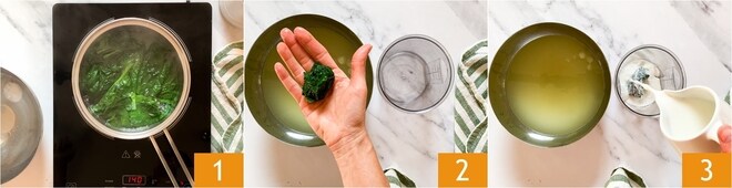 Pour préparer les crêpes à la courge, speck et noix, commencez par la pâte. Faites cuire les épinards dans un peu d'eau bouillante salée pendant 3 minutes 1, puis égouttez-les et plongez-les dans de l'eau glacée. Essorez-les, transférez-les dans le verre d'un mixeur et mixez-les avec le lait 2.