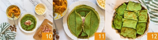 Faites cuire les crêpes en beurrant légèrement la poêle antiadhésive. Retournez-les une seule fois dès qu'elles se décollent de la poêle. Maintenant, composez-les : mettez sur chaque crêpe une cuillerée de crème de courge, un peu de speck, les noix grossièrement hachées et la scamorza coupée en dés 10. Refermez deux bords vers l'intérieur 11 et enroulez-la sur elle-même. Transférez les crêpes sur une plaque recouverte de papier sulfurisé et faites cuire pendant 10/12 minutes dans un four statique préchauffé à 180°.