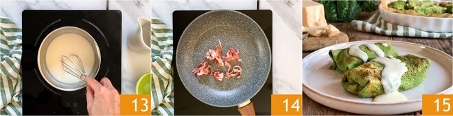 En attendant, préparez la fondue avec le fromage râpé et le lait. Faites-la cuire à feu moyen pendant 4 minutes 13, jusqu'à ce qu'elle devienne lisse. Dans une poêle, faites également sauter le speck restant 14. Sortez les crêpes farcies du four, versez dessus la fondue 15, le speck croustillant et quelques morceaux de noix émiettés. Servez les crêpes encore chaudes!