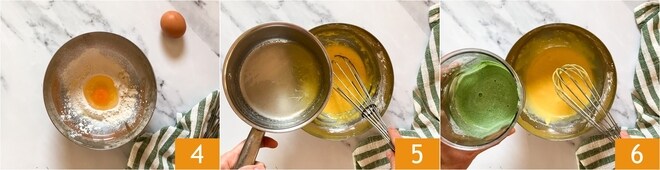 Faites fondre le beurre à feu très doux et laissez-le refroidir. Tamisez la farine dans un bol, ajoutez les œufs 4 et mélangez bien avec un fouet. Ajoutez le beurre fondu 5, le mélange de lait et d'épinards 6 et le sel. Laissez reposer la pâte au réfrigérateur pendant une demi-heure.