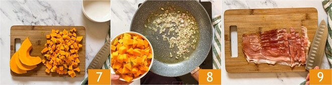 Hachez finement l'échalote et coupez la courge en dés 7. Faites revenir l'échalote dans une poêle antiadhésive avec un filet d'huile. Ajoutez la courge 8, assaisonnez de sel, de poivre et de muscade. Laissez cuire jusqu'à ce que les dés de courge deviennent tendres, en ajoutant quelques cuillères à soupe d'eau si nécessaire. Lorsqu'elle est cuite, écrasez-la avec une fourchette et mettez-la de côté. Coupez le speck en lanières 9 et mettez-en un tiers de côté.