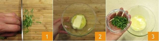 Pour réaliser le crostone beurre et sardines, commencez par hacher le persil 1, faites fondre le beurre dans un petit bol 2, juste assez pour obtenir une crème, ajoutez le persil haché 3