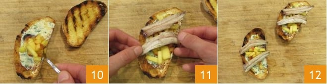Disposez une cuillère de pêches en dés et terminez avec les filets de sardines 11. Les crostini beurre et sardines sont prêts à être dégustés 12 !