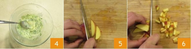 et mélangez 4. Mettez de côté la sauce au beurre et occupez-vous de la pêche : lavez-la, coupez-la en deux, retirez le noyau puis coupez-la d'abord en tranches 5 et ensuite coupez ces tranches en dés 6. Recueillez-les dans un bol.