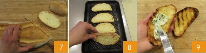 Coupez le pain de campagne en tranches 7, chauffez une grille et faites griller le pain 8 jusqu'à ce qu'il soit doré et croustillant. Tout est prêt pour composer les crostini : prenez une tranche de pain grillé, étalez la crème de beurre dessus 9