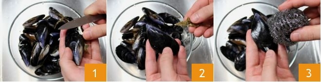 Transférez-les dans un grand bol et, après les avoir soigneusement lavées sous l'eau courante, utilisez le dos de la lame d'un couteau pour éliminer toutes les incrustations et les balanes 1. Avec un mouvement énergique, détachez ensuite manuellement le byssus qui sort des valves 2. Ensuite, toujours sous l'eau froide courante, frottez énergiquement les moules en utilisant une paille de fer ou une brosse dure 3.