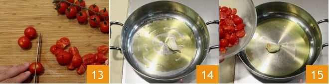 Après les avoir lavés, coupez les tomates cerises en quartiers 13. Arrosez une autre casserole avec le reste de l'huile d'olive et faites-y revenir l'autre gousse d'ail en chemise 14, ajoutez les tomates cerises 15.