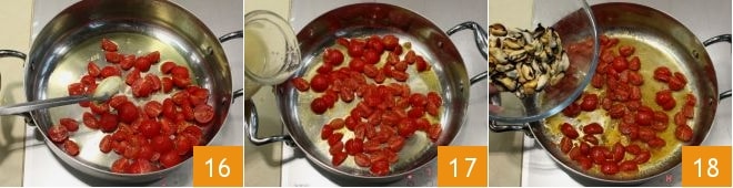 Dès que l'ail est bien doré, retirez-le à l'aide de pinces 16, ajoutez le liquide des moules et en baissant le feu, réduisez le tout pendant 5-6 minutes 17 : veillez à ce que les tomates cerises ne se défassent pas trop. Ajoutez à ce stade les moules décortiquées 18 et mélangez pour amalgamer toutes les saveurs pendant quelques minutes.