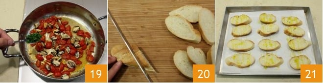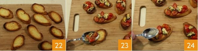 Lorsque les crostini sont prêts, disposez-les sur une planche 22 et, à l'aide d'une cuillère, garnissez chacun de quelques tomates cerises et de 2 mollusques en belle vue 23.