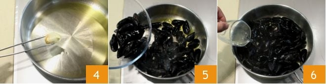 Dans une casserole antiadhésive, faites revenir une partie de l'huile d'olive avec la gousse d'ail en chemise, que vous pouvez retirer lorsqu'elle est dorée 4. Versez dans l'huile les moules nettoyées 5 et déglacez immédiatement avec le vin blanc 6.
