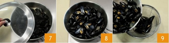 Couvrez la casserole avec un couvercle 7 et laissez cuire à feu vif pendant 5 minutes, le temps nécessaire pour les ouvrir. Lorsqu'elles sont prêtes 8, égouttez les moules en plaçant un bol sous la passoire pour recueillir le liquide de cuisson 9.