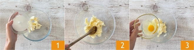 Pour préparer la sbriciolata aux pommes, commencez par la pâte. Dans un bol, mettez le beurre avec le sucre 1. Ramollissez-le avec une cuillère en bois jusqu'à ce qu'il devienne crémeux 2. Ajoutez l'œuf 3 et mélangez jusqu'à ce qu'il soit bien incorporé.