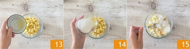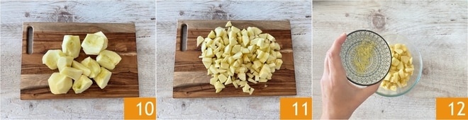 Préparez la garniture de pommes et d'amaretti. Épluchez les pommes, coupez-les en deux, retirez le trognon, puis coupez-les en 4 quartiers 10. Découpez ensuite des dés de 1 cm de côté 11. Transférez les cubes de pomme dans un bol et ajoutez le zeste de citron 12.