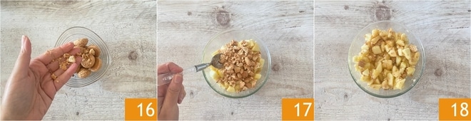 Émiettez grossièrement les amaretti avec les mains 16 et ajoutez-les aux pommes 17. Mélangez bien 18.