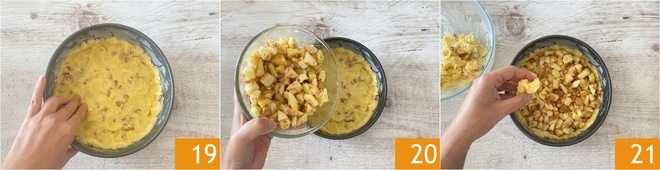 Beurrez et farinez un moule à charnière de 20 cm de diamètre. Mettez ¾ de la pâte au fond du moule, compressez avec les mains pour couvrir tout le fond et élever les bords pour contenir la garniture 19. Versez à l'intérieur les pommes avec les amaretti 20, égalisez et recouvrez avec le reste de la pâte émiettée 21.
