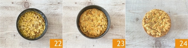 Essayez de recouvrir entièrement les pommes, sans tasser cette fois 22. Faites cuire la sbriciolata aux pommes dans un four statique préchauffé à 180°C pendant environ 35 minutes. Sortez-la du four 23 et laissez-la refroidir complètement avant de la démouler 24 et de la servir.