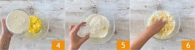 Incorporez la farine 00 préalablement tamisée 4 et la levure chimique également tamisée 5. Pétrissez du bout des doigts 6 jusqu'à obtenir une pâte émiettée.