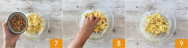 À ce stade, ajoutez également les noix 7 et donnez un autre coup de pétrissage rapide 8 pour bien mélanger les ingrédients 9. Réservez au réfrigérateur jusqu'à utilisation.