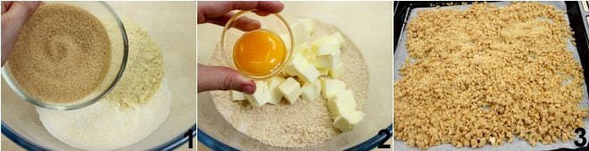 Commencez la préparation du crumble aux pêches avec la pâte à crumble : mettez dans un bol les deux farines (blanche et d'amandes), ajoutez le sucre de canne 1, la cannelle, le beurre (froid du réfrigérateur et coupé en dés) et le jaune d'œuf 2. Travaillez-les brièvement avec une cuillère en bois, de manière à ne pas les amalgamer complètement, mais à les laisser bien émiettés, obtenant ainsi des miettes de pâte. Laissez reposer la pâte pendant 10 minutes au réfrigérateur, puis transférez le crumble sur une plaque couverte d'une feuille de papier sulfurisé, en essayant d'espacer la pâte 3.
