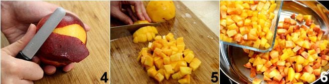Entre-temps, pelez les pêches 4 et coupez-les en dés 5, mettez-les ensuite dans une poêle où vous aurez fait fondre le beurre 6, ajoutez le sucre en poudre et les graines de vanille.