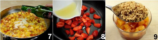 Dans une autre casserole, mettez les fraises bien lavées et coupées en quartiers et faites-les cuire pendant 2-3 minutes avec le jus de citron 8 et le sucre de canne. Ensuite, composez le crumble aux pêches en utilisant des verrines individuelles : déposez au fond les fraises, ajoutez la compote de pêches et enfin la pâte croustillante du crumble 9. Servez le crumble aux pêches froid !