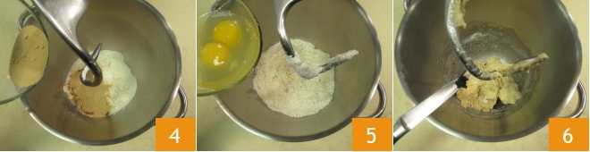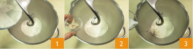 Pour préparer le danubio à la Nutella, commencez par verser dans le bol d'un robot pâtissier équipé du crochet la farine 00 et la manitoba 1, ajoutez la levure de bière émiettée 2, le lait à température ambiante 3.