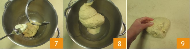 C'est maintenant le moment du beurre, ajouté morceau par morceau à température ambiante 7. Ne soyez pas pressé à cette étape et laissez travailler jusqu'à ce que la pâte soit bien accrochée au crochet 8. Versez la pâte sur le plan de travail et travaillez-la brièvement à la main 9.