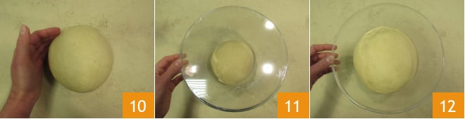 Formez une boule 10 et placez la pâte dans un bol, couvrez avec un film plastique 11. Laissez lever pendant environ deux heures à température ambiante (la température idéale est de 25/27°) ou jusqu'à ce que la pâte double de volume 12.