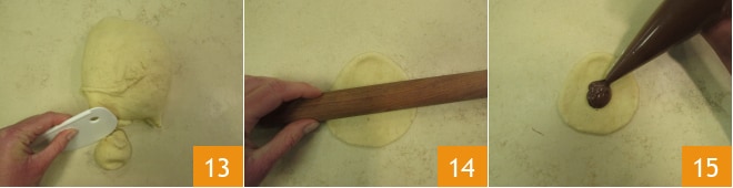 Après le temps de repos, détachez la pâte du bol et divisez-la en 20 morceaux de 35 g chacun à l'aide d'une corne 13. Aplatissez avec un rouleau à pâtisserie 14 et, à l'aide d'une poche à douille, garnissez le milieu avec 10 g de Nutella 15.