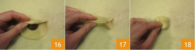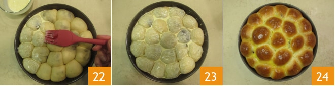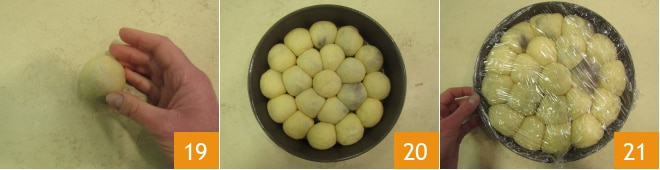 Roulez délicatement pour obtenir des boules et assurez-vous qu'elles soient bien fermées pour que la garniture ne s'échappe pas 19. Continuez ainsi avec toutes les boules et transférez-les au fur et à mesure dans un moule évasé, dont la base mesure 22 cm, préalablement beurré 20. Couvrez avec un film plastique, simplement posé sur la surface, et laissez lever encore une heure environ 21.