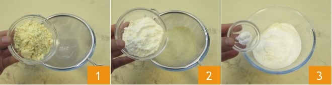 Pour réaliser l'entrée des fêtes, commencez par préparer la base : tamisez dans un bol la farine de pois chiches 1 et la farine 00, puis ajoutez la levure chimique 3.