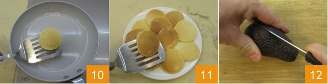 continuez la cuisson pendant encore 2-3 minutes jusqu'à ce qu'il soit doré 10. Au fur et à mesure de leur cuisson, déposez-les sur une assiette 11. Continuez la cuisson des blinis jusqu'à épuisement de la pâte. Avec les doses indiquées, vous obtiendrez 12 blinis. Maintenant, occupez-vous de l'avocat : divisez-le en deux 12