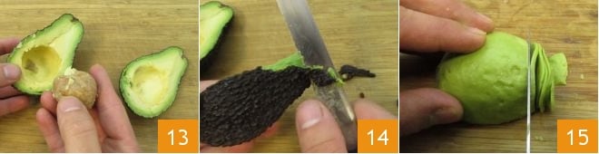 Enlevez le noyau 13, épluchez le fruit avec un couteau 14, puis coupez chaque moitié en fines tranches 15.
