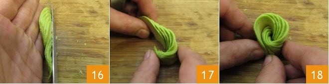 Formez chaque rose avec environ 10 fines tranches d'avocat de cette façon : gardez les tranches proches les unes des autres, ouvrez-les en éventail en vous aidant de la lame d'un couteau et de la paume de la main 16 en les faisant glisser verticalement. Ensuite, enroulez-les en spirale 17 pour donner la forme typique de la rose 18.