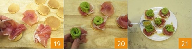 Tout est prêt pour composer l'entrée : prenez un blini, déposez dessus une tranche de jambon cru 19 et une petite rose d'avocat 20. Accompagnez l'entrée de quelques cuillères de marmelade d'orange (pour la rendre plus liquide, vous pouvez la travailler légèrement avec un mixeur plongeant 21) et servez immédiatement votre entrée crue et avocat.
