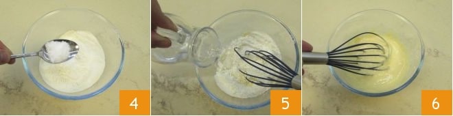 Ajoutez le sel 4, puis commencez à mélanger avec un fouet en versant l'eau petit à petit jusqu'à l'incorporer entièrement (5-6).