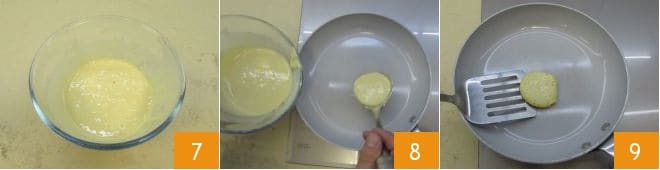 Lorsque la pâte sera bien lisse et sans grumeaux 7, vous pourrez passer à la cuisson : chauffez une petite poêle antiadhésive et versez une louche de pâte 8, faites cuire pendant 2-3 minutes, puis retournez le blini avec une spatule 9,