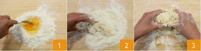 Pour préparer les pochettes avec burrata, artichauts et sauce tomate, commencez par les pâtes fraîches : disposez la farine en fontaine sur un plan de travail (vous pouvez également verser les ingrédients dans un bol pour les travailler), cassez les œufs au centre et commencez à mélanger avec une fourchette 1, puis une fois que les œufs sont absorbés, continuez à la main en pétrissant vigoureusement 2 3 jusqu'à obtenir une pâte lisse.